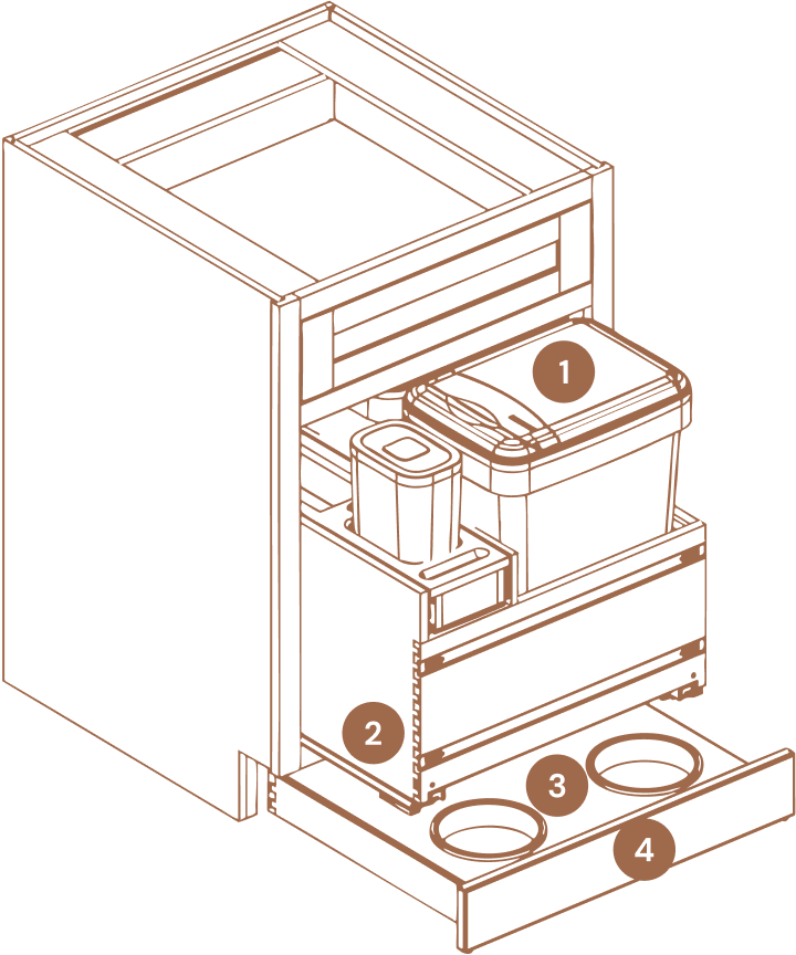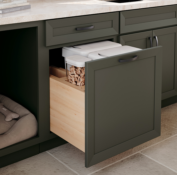 Next-level ingenuity, beautifully concealed. Our built-in Pet Food Station features a sliding toe-kick drawer with integrated feeding bowls, placing meals right at your companion’s level while maintaining a seamless aesthetic.