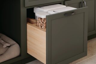 Base Cabinet with Pet Feeding Station. Shown in Harlan in Cavern on maple....