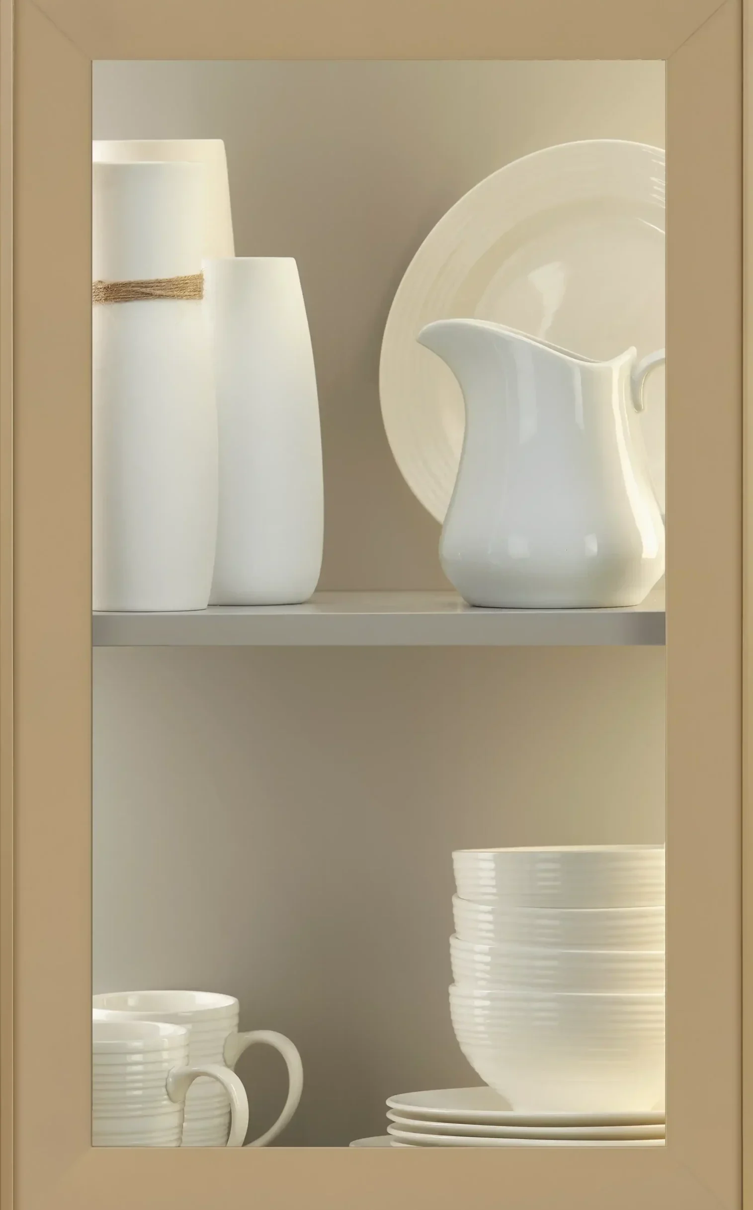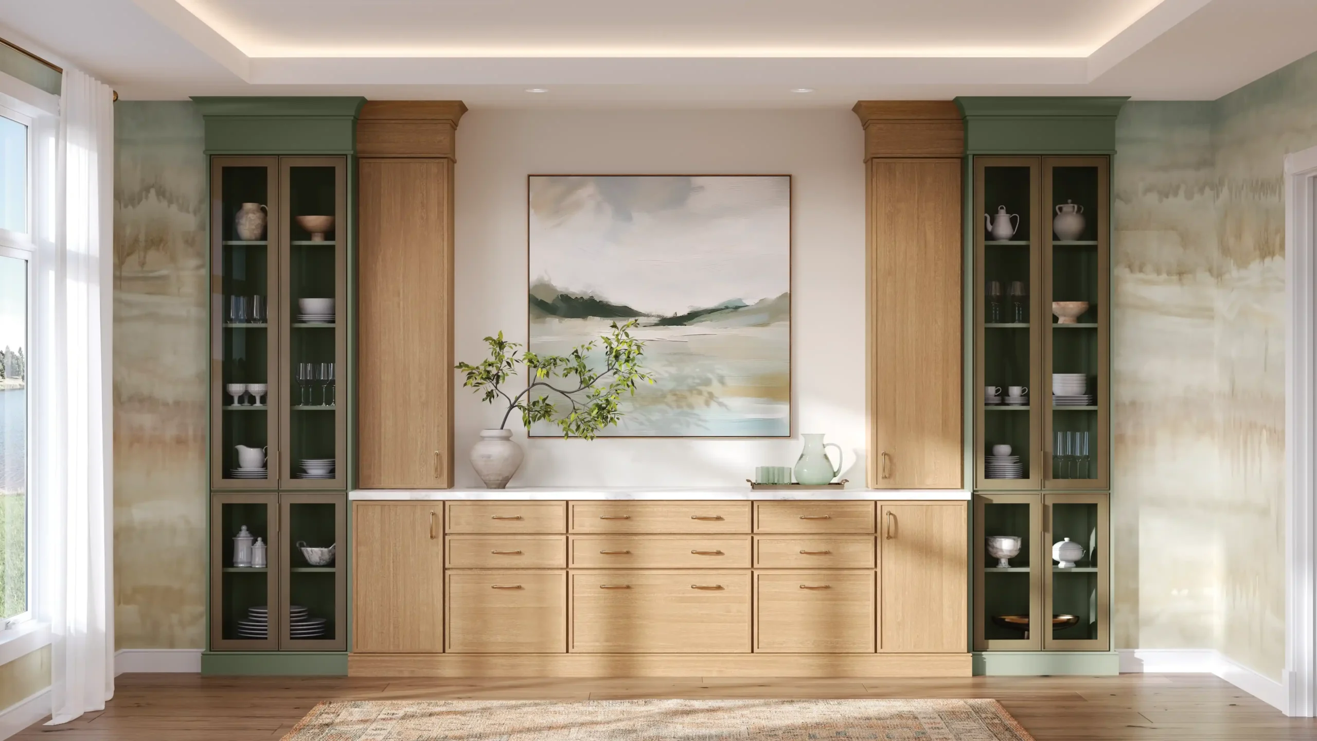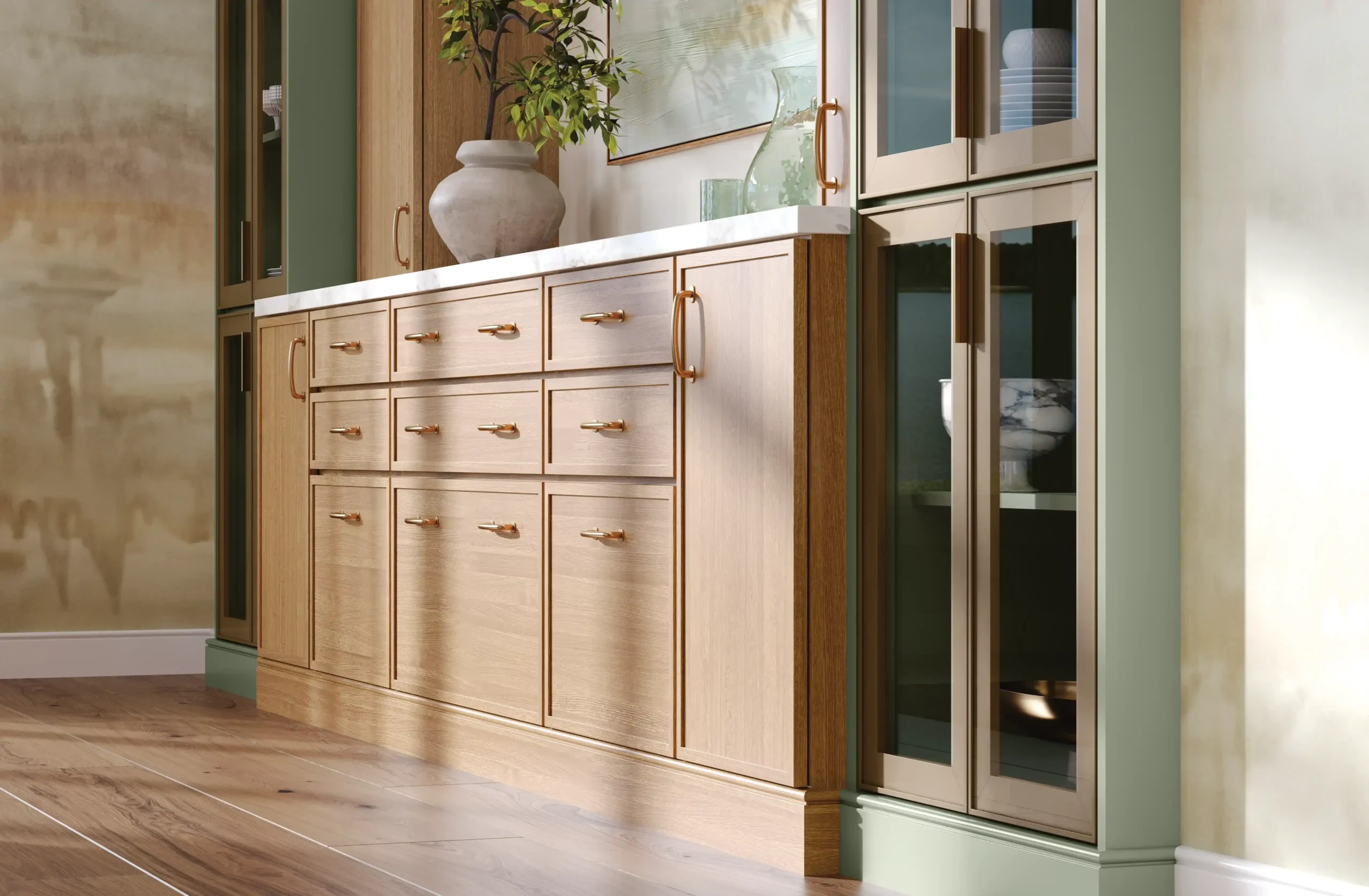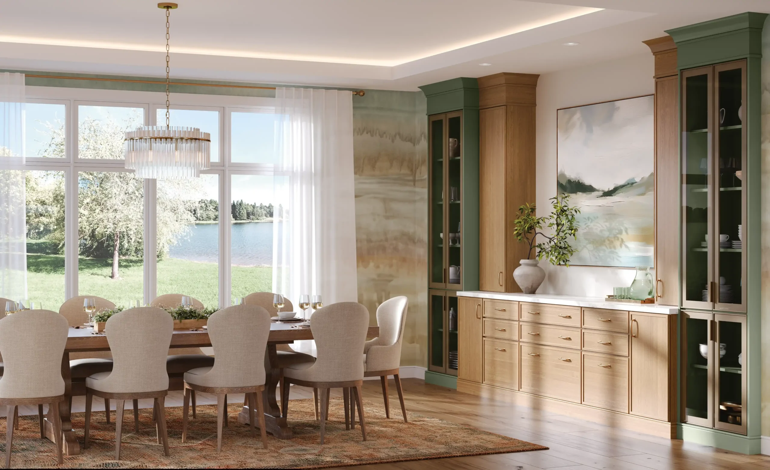 When serving becomes ceremony. Lead by our Apollo door in Lynx on quartersawn oak and beautifully framed by the pairing of Succulent on maple and Catania metal doors in Gold with clear glass inserts, this space exudes organic richness. Whether the evening calls for an intimate dinner or a holiday feast with friends, the robust built-in buffet and serving counter allows the host to entertain endless possibilities.